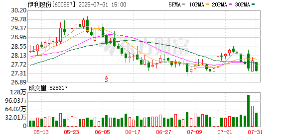 证券时报·数据宝统计显示,伊利股份今日收盘价为27.41元,下跌1.69%,日换手率为0.84%,成交额为14.54亿元,全天主力资金净流出1.84亿元,近5日该股累计下跌2.94%,近5日资金合计净流出3.80亿元。